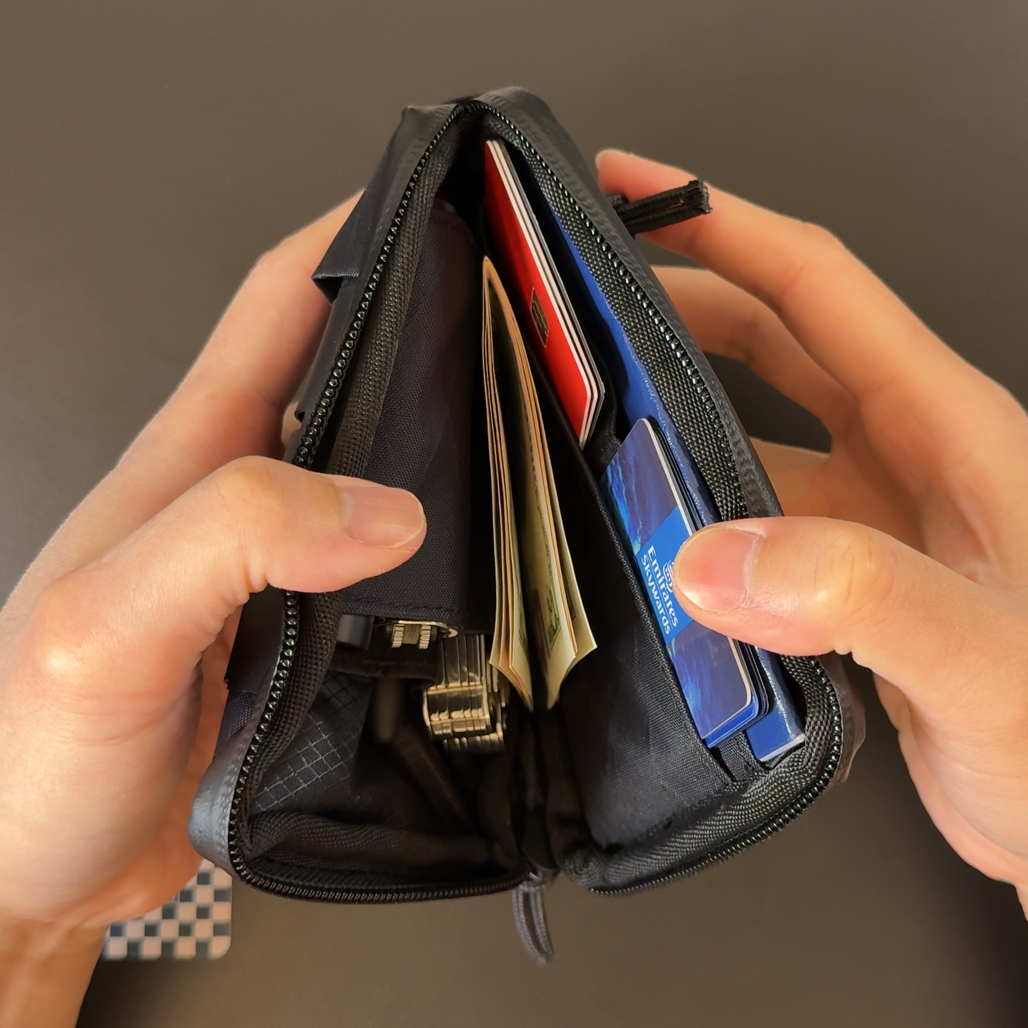 - L-shaped zipper for quick, secure access to cash and cards.